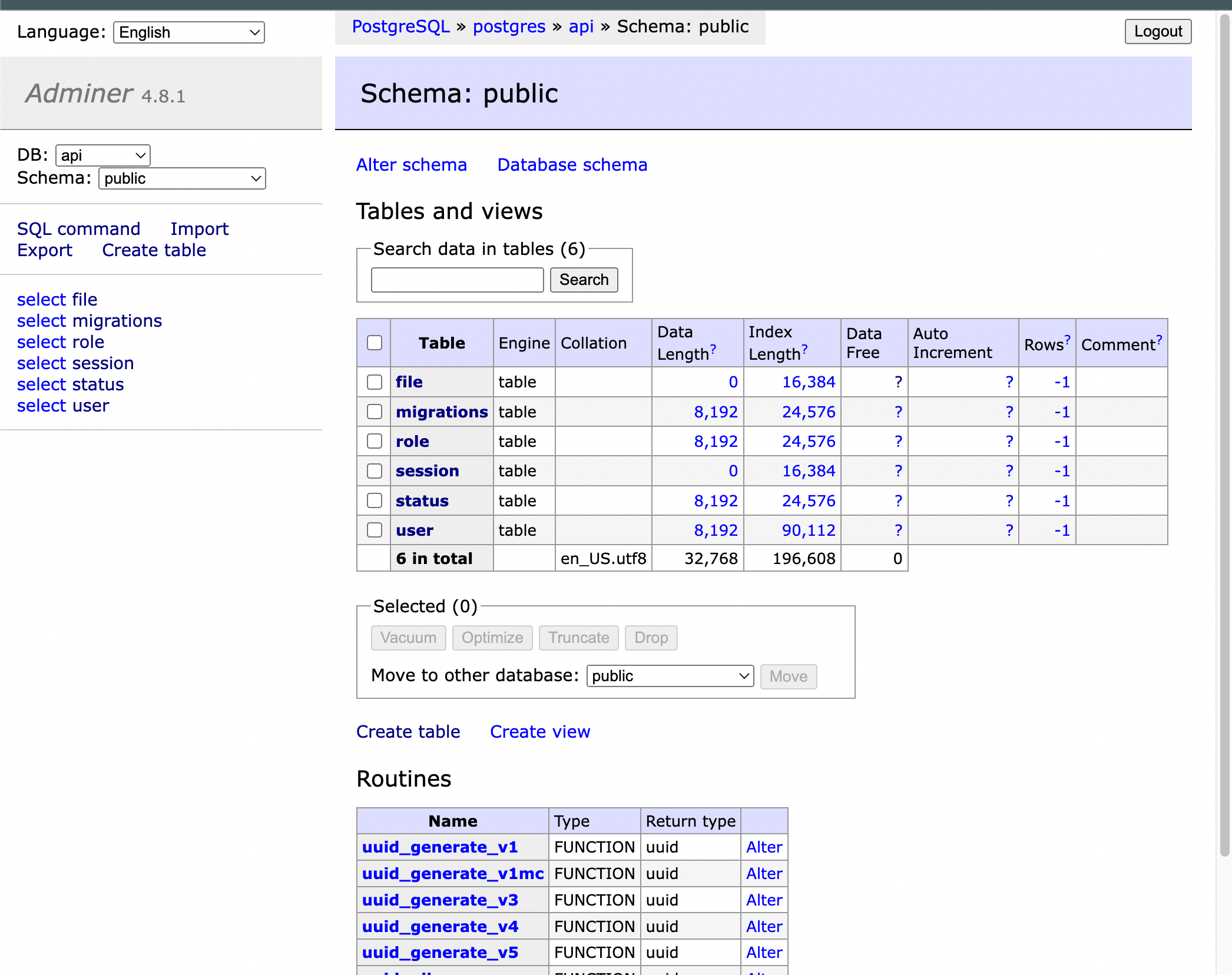 adminer서비스에 접속해 마이그레이션된 모습을 확인할 수 있습니다.