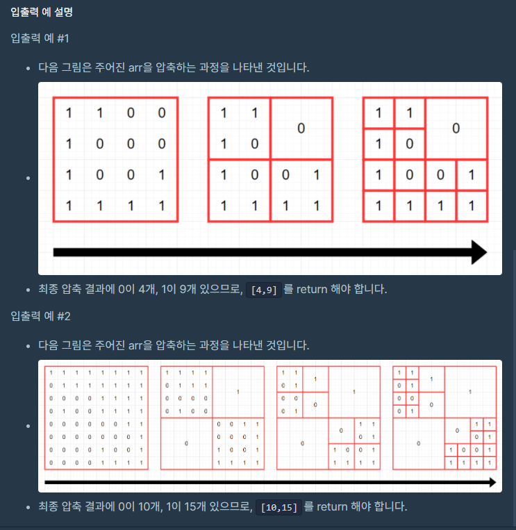 arr이 매개변수로 주어집니다. 위와 같은 방식으로 arr을 압축했을 때, 배열에 최종적으로 남는 0의 개수와 1의 개수를 배열에 담아서 return 하도록 solution 함수를 완성해주세요.