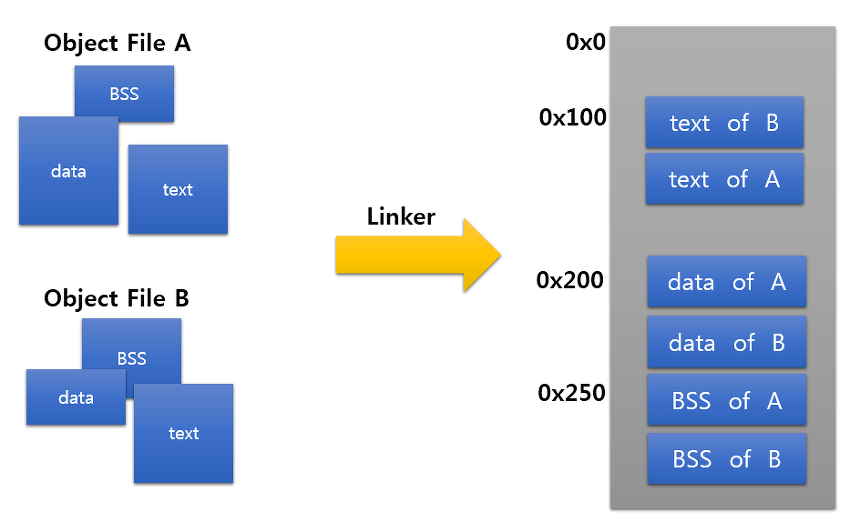 1번째 과정이예요 여러 오브젝트 파일에 있는 동일한 섹션들을 하나의 덩어리로 합칩니다.