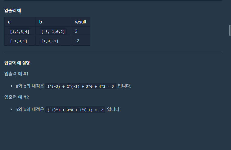 이때, a와 b의 내적은 a[0]*b[0] + a[1]*b[1] + ... + a[n-1]*b[n-1] 입니다. (n은 a, b의 길이)