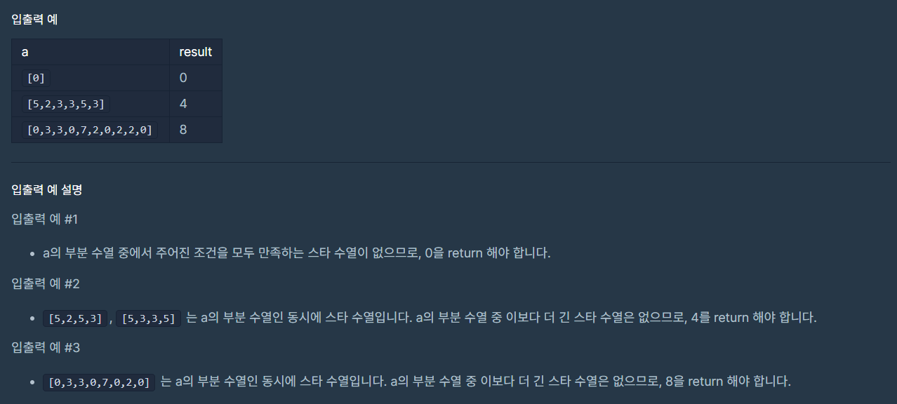 - 예를 들어, [1,2,1,3,4,1,1,3]은 스타 수열입니다. {1,2}, {1,3}, {4,1}, {1,3} 의 교집합은 {1} 이고, 각 집합 내의 숫자들이 서로 다르기 때문입니다.