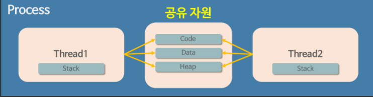 - 스레드는 프로세스 내에서 각각 stack만 따로 할당받고 code, data, heap영역은 공유한다.
