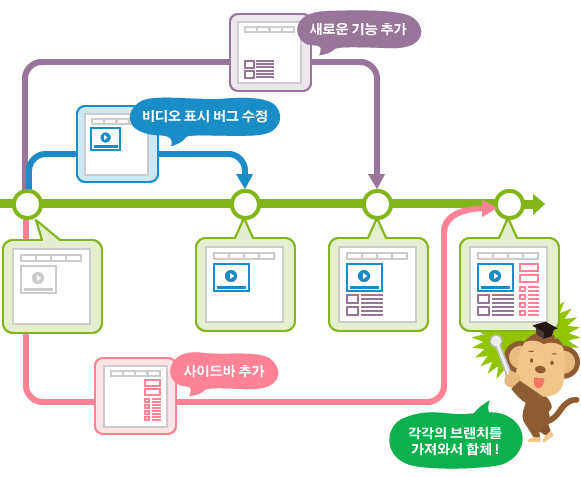 또한 이렇게 만들어진 브랜치는 다른 브랜치와 병합(Merge)함으로써, 작업한 내용을 다시 새로운 하나의 브랜치로 모을 수 있습니다.