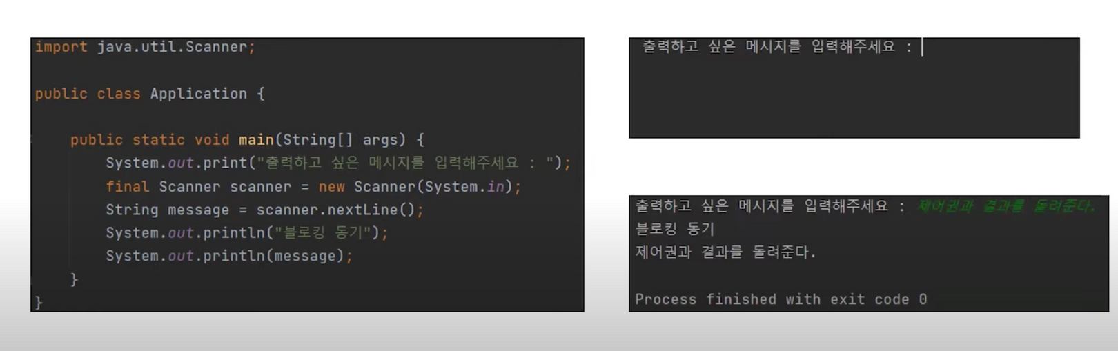 Blocking의 관점은 제어권에 있습니다 → 그래서 한 작업이 동작할 때 다른 작업은 동작하지 않습니다.