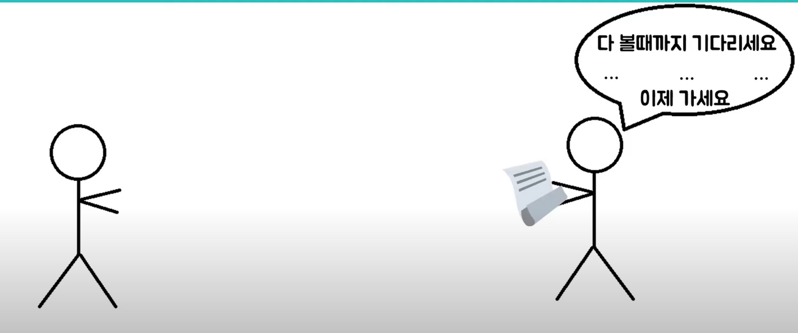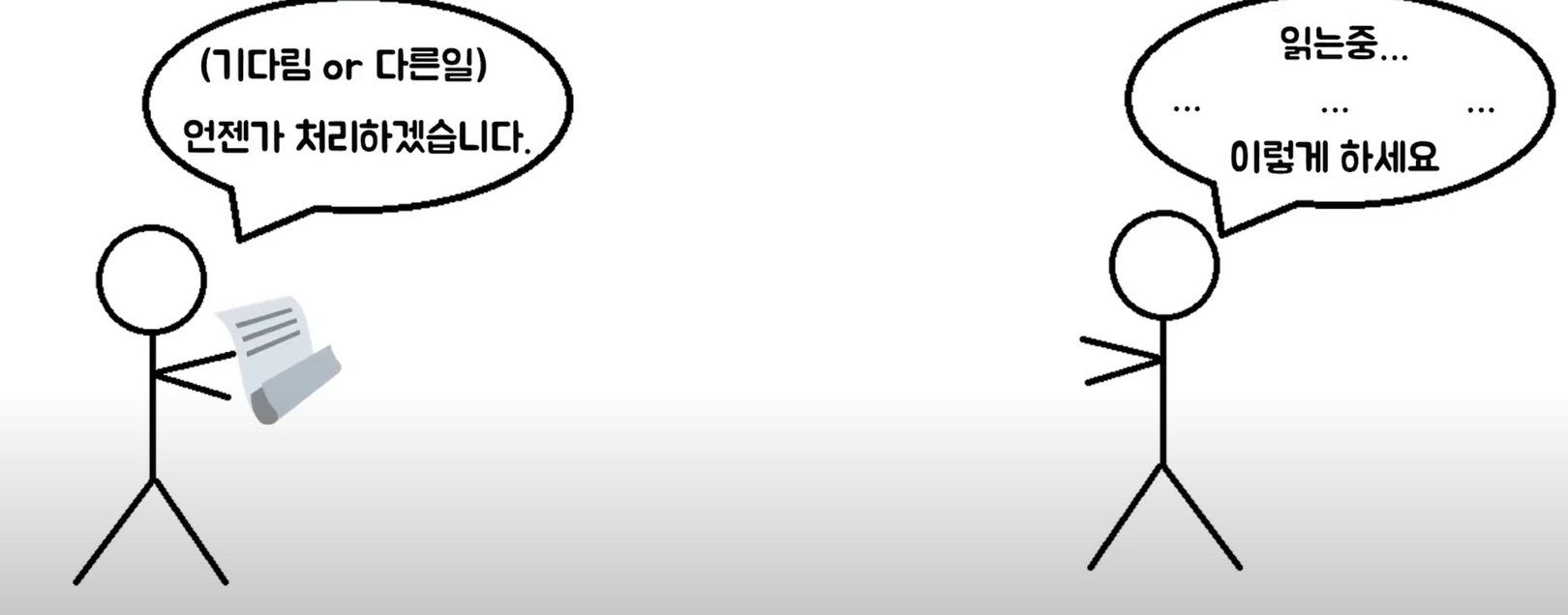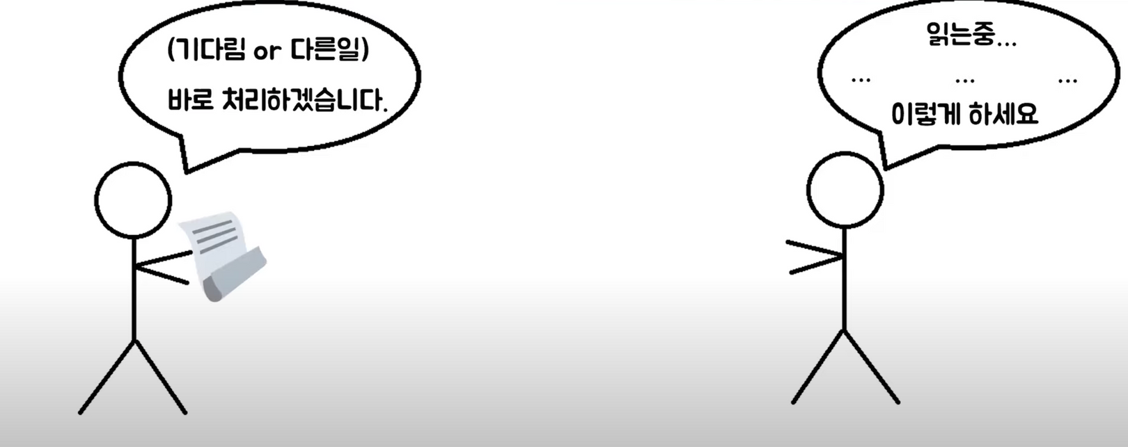 - 이메일로 물어보고 메일 송신을 완료(return)했지만 답은 언제 올지 모른다. = 비동기 요청처리