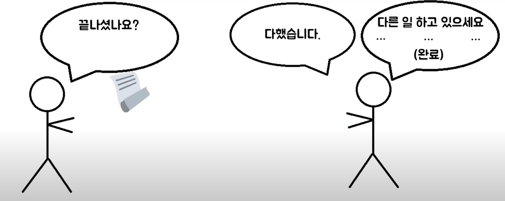 - 전화를 했는데 안 받음끊었다가 나중에 다시 전화함계속 반복했다가 어느 순간에 받아서 답을 얻음 = 동기 + 논블록킹