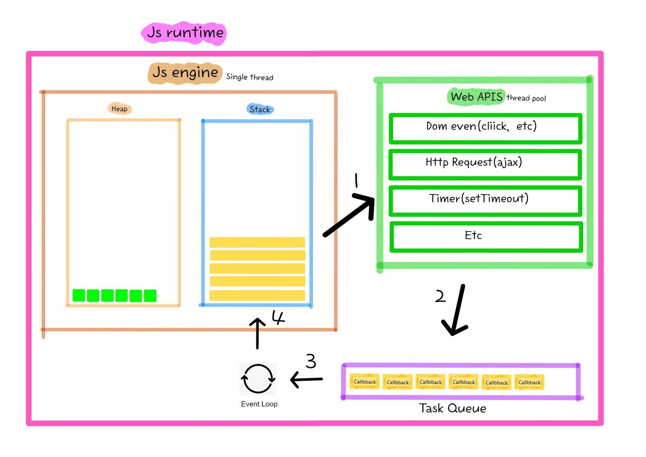 - → Web API, Event Table, Callback Queue, Event Loop 덕분에 자바스크립트를 멀티 스레드처럼 작동시킬 수 있습니다.