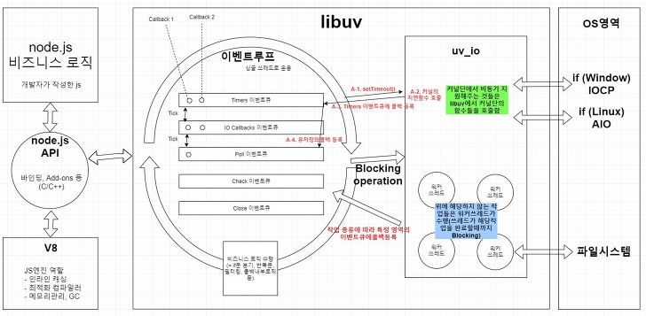 - Nods.js는 비동기 지원을 위해 libuv라이브러리를 사용하며, 이 linuv 가 이벤트 루프를 제공함. → 자바스크립트 엔진은 비동기 작업을 위해 노드js의 api를 호출하며, 이 때 넘겨진 콜백은 libuv의 이벤트 루프를 통해 스케쥴되고 실행됨. (단, 자바스크립트 엔진의 이벤트 루프와는 다르게 동작함)