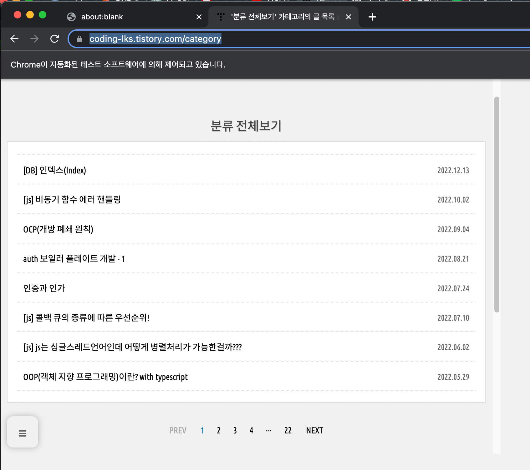 제 블로그의 게시물들의 정보를 수집하기 위해 https://coding-lks.tistory.com/category 분류 전체 보기 url로 페이지를 이동시켜 보겠습니다.