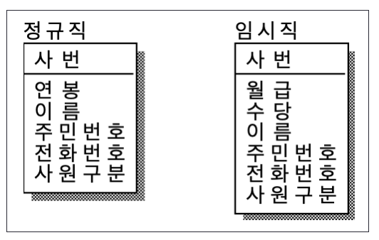 정규직 사원은 연봉으로, 임시직 사원은 월급이나 수당으로 급여내역이 정의된다고 할 때 하나의 엔티티로 해당 데이터들을 다룬다면