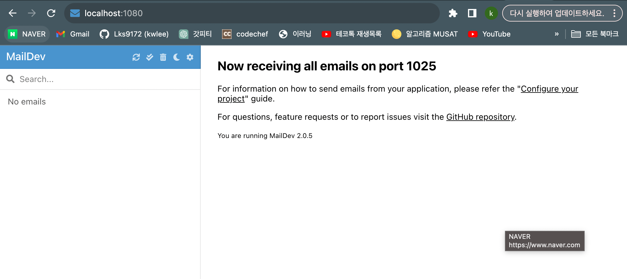방금 실행해서 아무 메일도 없지만 1080port에 접속이 잘되는 모습을 볼 수 있습니다.