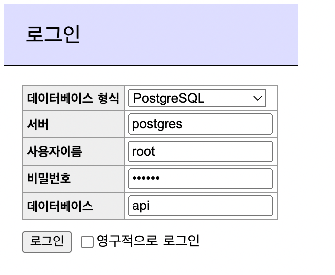 데이터베이스를 시각화하고 관리하기 위한 Adminer를 실행합니다.adminer이미지를 사용하여 8080 포트로 접속 가능합니다. - API 서비스:
