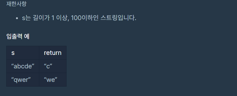 단어 s의 가운데 글자를 반환하는 함수, solution을 만들어 보세요. 단어의 길이가 짝수라면 가운데 두글자를 반환하면 됩니다.
