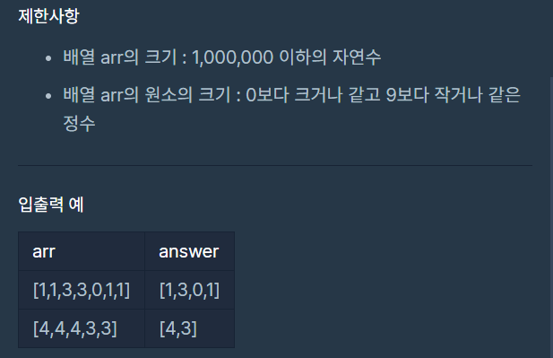 - arr = [1, 1, 3, 3, 0, 1, 1] 이면 [1, 3, 0, 1] 을 return 합니다.