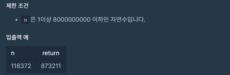 함수 solution은 정수 n을 매개변수로 입력받습니다. n의 각 자릿수를 큰것부터 작은 순으로 정렬한 새로운 정수를 리턴해주세요. 예를들어 n이 118372면 873211을 리턴하면 됩니다.