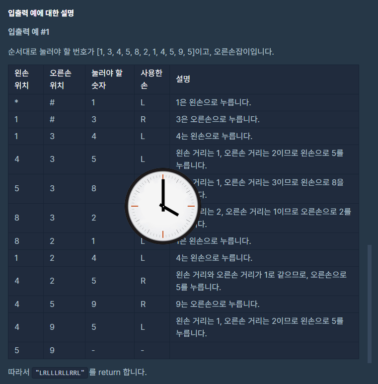 순서대로 누를 번호가 담긴 배열 numbers, 왼손잡이인지 오른손잡이인 지를 나타내는 문자열 hand가 매개변수로 주어질 때, 각 번호를 누른 엄지손가락이 왼손인 지 오른손인 지를 나타내는 연속된 문자열 형태로 return 하도록 solution 함수를 완성해주세요.
