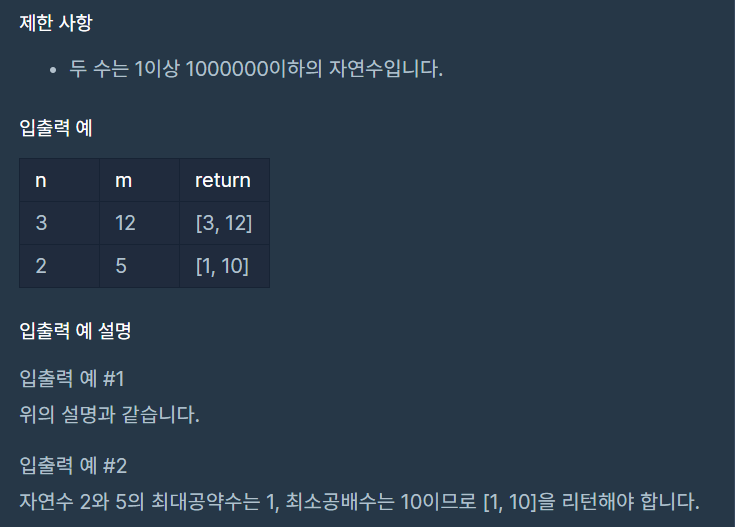 두 수를 입력받아 두 수의 최대공약수와 최소공배수를 반환하는 함수, solution을 완성해 보세요. 배열의 맨 앞에 최대공약수, 그다음 최소공배수를 넣어 반환하면 됩니다. 예를 들어 두 수 3, 12의 최대공약수는 3, 최소공배수는 12이므로 solution(3, 12)는 [3, 12]를 반환해야 합니다.