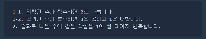 1937년 Collatz란 사람에 의해 제기된 이 추측은, 주어진 수가 1이 될때까지 다음 작업을 반복하면, 모든 수를 1로 만들 수 있다는 추측입니다. 작업은 다음과 같습니다.