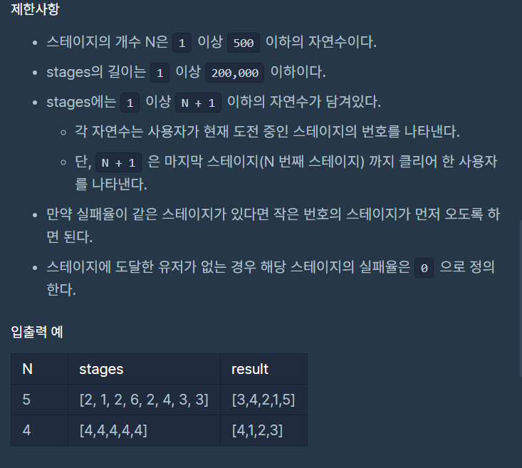전체 스테이지의 개수 N, 게임을 이용하는 사용자가 현재 멈춰있는 스테이지의 번호가 담긴 배열 stages가 매개변수로 주어질 때, 실패율이 높은 스테이지부터 내림차순으로 스테이지의 번호가 담겨있는 배열을 return 하도록 solution 함수를 완성하라.