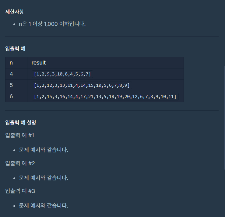 정수 n이 매개변수로 주어집니다. 다음 그림과 같이 밑변의 길이와 높이가 n인 삼각형에서 맨 위 꼭짓점부터 반시계 방향으로 달팽이 채우기를 진행한 후, 첫 행부터 마지막 행까지 모두 순서대로 합친 새로운 배열을 return 하도록 solution 함수를 완성해주세요.