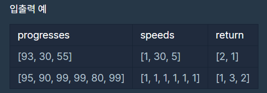 - 작업의 개수(progresses, speeds배열의 길이)는 100개 이하입니다.