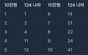 주어진 숫자를 "124"로 진법변환을 시키는 문제이다.
