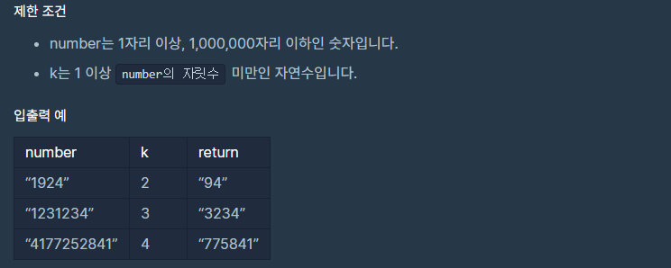 문자열 형식으로 숫자 number와 제거할 수의 개수 k가 solution 함수의 매개변수로 주어집니다. number에서 k 개의 수를 제거했을 때 만들 수 있는 수 중 가장 큰 숫자를 문자열 형태로 return 하도록 solution 함수를 완성하세요.