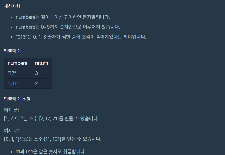 각 종이 조각에 적힌 숫자가 적힌 문자열 numbers가 주어졌을 때, 종이 조각으로 만들 수 있는 소수가 몇 개인지 return 하도록 solution 함수를 완성해주세요.