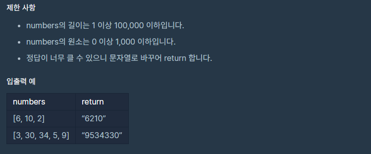 0 또는 양의 정수가 담긴 배열 numbers가 매개변수로 주어질 때, 순서를 재배치하여 만들 수 있는 가장 큰 수를 문자열로 바꾸어 return 하도록 solution 함수를 작성해주세요.