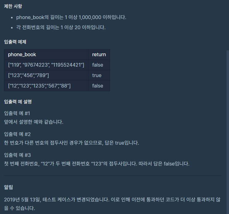 전화번호부에 적힌 전화번호를 담은 배열 phone_book 이 solution 함수의 매개변수로 주어질 때, 어떤 번호가 다른 번호의 접두어인 경우가 있으면 false를 그렇지 않으면 true를 return 하도록 solution 함수를 작성해주세요.