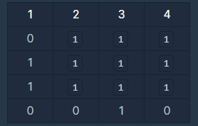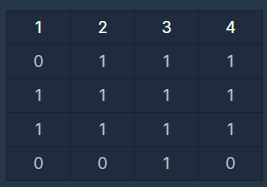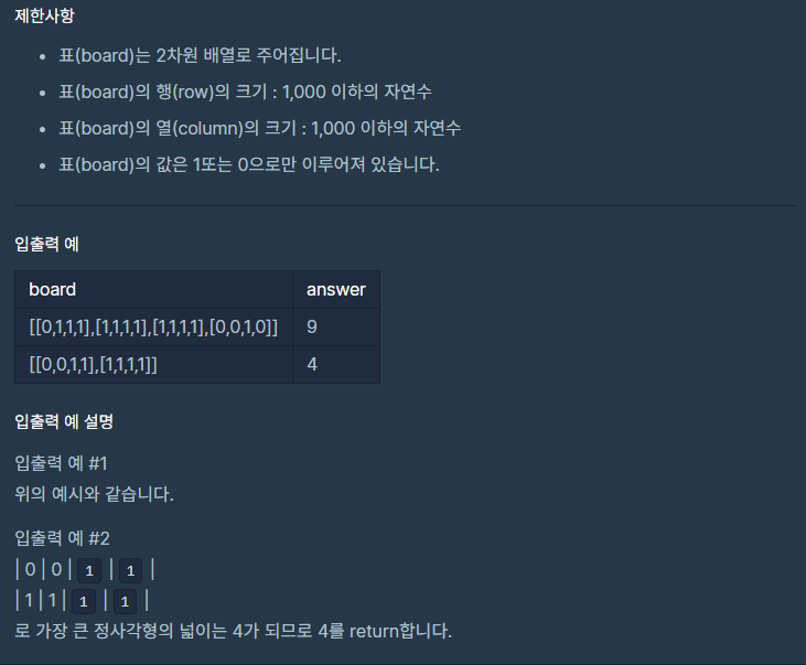 1와 0로 채워진 표(board)가 있습니다. 표 1칸은 1 x 1 의 정사각형으로 이루어져 있습니다. 표에서 1로 이루어진 가장 큰 정사각형을 찾아 넓이를 return 하는 solution 함수를 완성해 주세요. (단, 정사각형이란 축에 평행한 정사각형을 말합니다.)