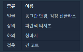 예를 들어 스파이가 가진 옷이 아래와 같고 오늘 스파이가 동그란 안경, 긴 코트, 파란색 티셔츠를 입었다면 다음날은 청바지를 추가로 입거나 동그란 안경 대신 검정 선글라스를 착용하거나 해야 합니다.