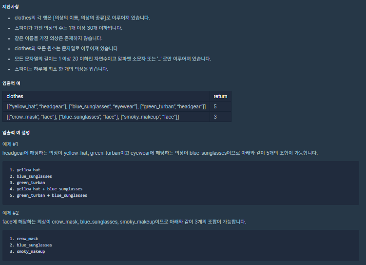 스파이가 가진 의상들이 담긴 2차원 배열 clothes가 주어질 때 서로 다른 옷의 조합의 수를 return 하도록 solution 함수를 작성해주세요.