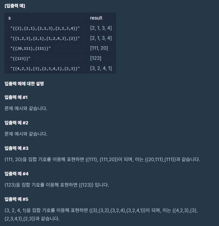 특정 튜플을 표현하는 집합이 담긴 문자열 s가 매개변수로 주어질 때, s가 표현하는 튜플을 배열에 담아 return 하도록 solution 함수를 완성해주세요.