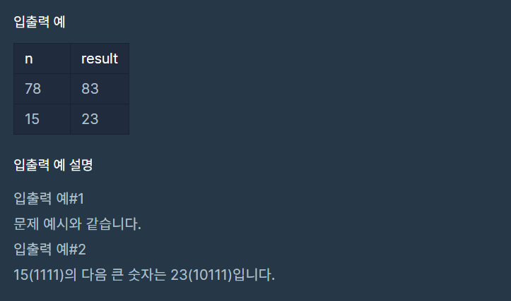 - 조건 3. n의 다음 큰 숫자는 조건 1, 2를 만족하는 수 중 가장 작은 수 입니다.