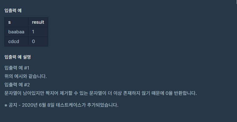짝지어 제거하기는, 알파벳 소문자로 이루어진 문자열을 가지고 시작합니다. 먼저 문자열에서 같은 알파벳이 2개 붙어 있는 짝을 찾습니다. 그다음, 그 둘을 제거한 뒤, 앞뒤로 문자열을 이어 붙입니다. 이 과정을 반복해서 문자열을 모두 제거한다면 짝지어 제거하기가 종료됩니다. 문자열 S가 주어졌을 때, 짝지어 제거하기를 성공적으로 수행할 수 있는지 반환하는 함수를 완성해 주세요. 성공적으로 수행할 수 있으면 1을, 아닐 경우 0을 리턴해주면 됩니다.