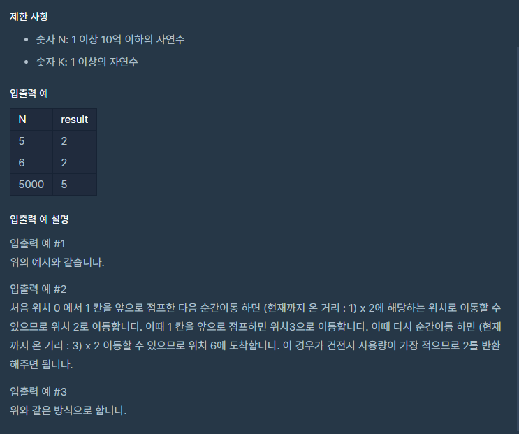 - 처음 위치 0 에서 2 칸을 앞으로 점프한 다음 순간이동 하면 (현재까지 온 거리 : 2) x 2에 해당하는 위치로 이동할 수 있으므로 위치 4로 이동합니다. 이때 1 칸을 앞으로 점프하면 도착하므로 건전지 사용량이 3 만큼 듭니다.