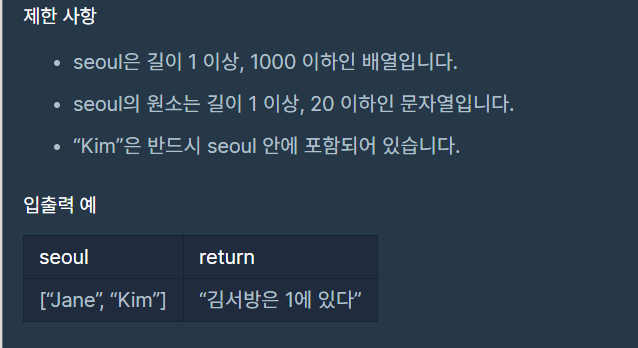 String형 배열 seoul의 element중 Kim의 위치 x를 찾아, 김서방은 x에 있다는 String을 반환하는 함수, solution을 완성하세요. seoul에 Kim은 오직 한 번만 나타나며 잘못된 값이 입력되는 경우는 없습니다.
