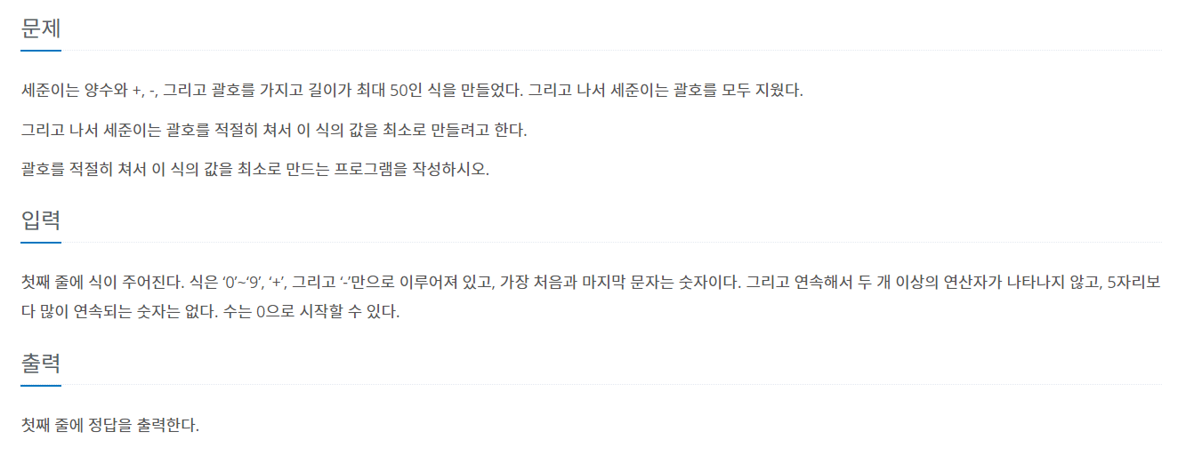 최소로 만들기위해서는 -부호가 등장 했을 경우 뒤의 내용에 모두 괄호를 씌워 주게 되면 최솟값을 구할 수 있다.